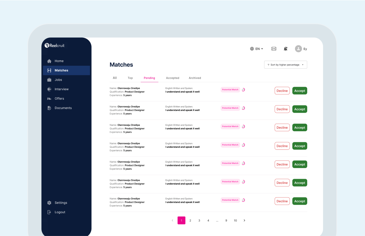 Design and prototype of the Reelcruit admin dashboard and Reelcruiters admin dashboard (desktop view only).